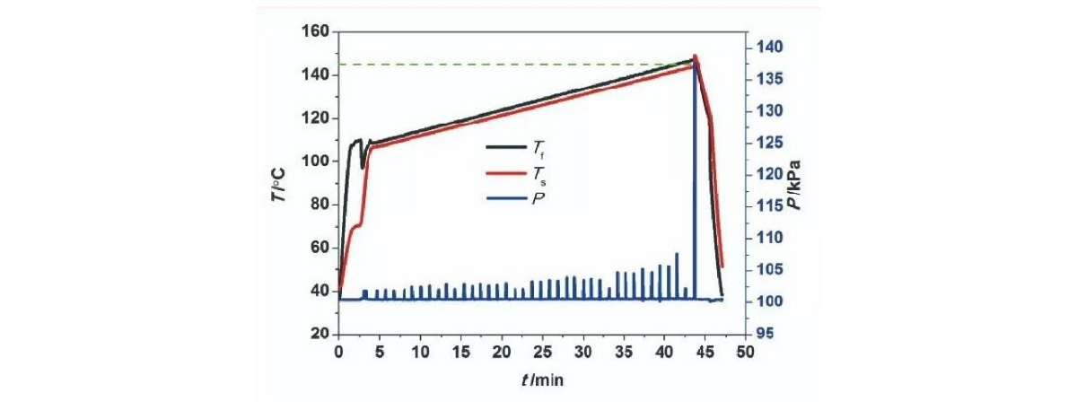 Рисунок 2 Данные, зарегистрированные во время испытания образца B с помощью микромасштабного непрерывно закрытого тестера температуры вспышки FP CC-420A (Tf — температура чашки образца, Ts — температура образца, P — давление внутри закрытой чашки образца)